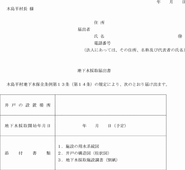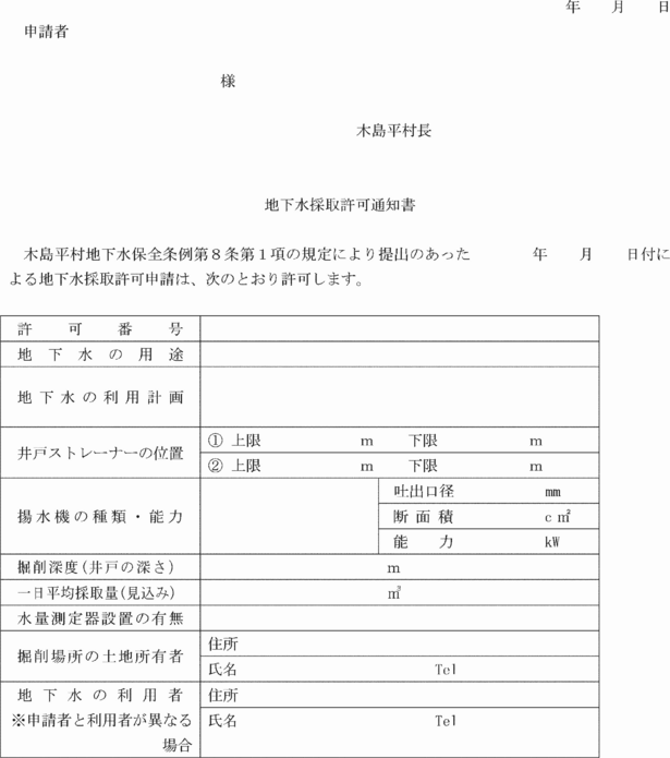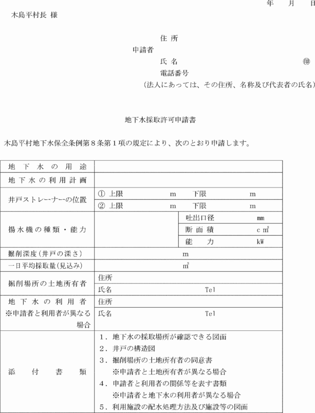第3条 条例第8条第1項に規定する許可申請は、地下水採取許可申請書(様式第1号)によるものとする。