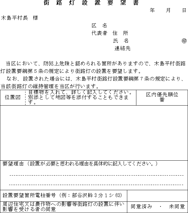 第5条 区長等は、街路灯の設置を要望するときは、街路灯設置要望書(様式第1号)を村長に提出するものとする。